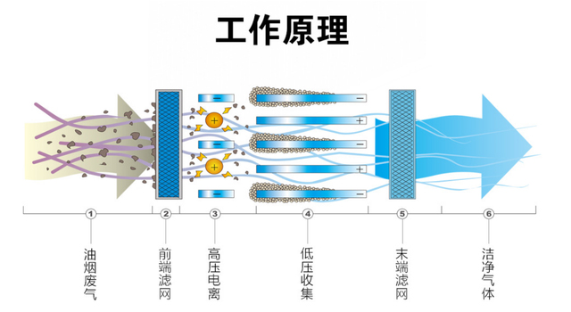 油煙由風機吸入油煙凈化器內,油煙中比較大的油污顆粒和油霧滴能在均流板上由于機械碰撞、阻流而被捕集到。當氣流進入高壓靜電場時,在高壓電場的作用下,油霧荷電、油煙氣體電離,絕大多數(shù)得以降解和炭化;一小部分微小的油粒在吸附電場的電場力及氣流的作用下向電場的正負兩極運動,并被收極到基板上。并在自身的重力的作用下流到集油盤上,并經過排油道排出去。剩下的微米級的油霧被電場降解成二氧化碳和水后排出潔凈的空氣;并且在高壓發(fā)生器的作用之下,電場內部的空氣產生臭氧,除去了煙氣當中的大部分的氣味。