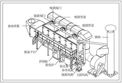 首先有機(jī)廢氣在風(fēng)機(jī)的作用下有機(jī)廢氣送入活性炭吸附箱進(jìn)行吸附凈化,凈化后的潔凈氣體由主排風(fēng)機(jī)排入大氣中。吸附裝置配有備用吸附箱1套,當(dāng)活性炭吸附飽和后通過(guò)控制閥門(mén)切換至催化燃燒脫附狀態(tài);脫附再生系統(tǒng)采用在線脫附再生,即吸附過(guò)程為連續(xù)式處理工藝,在備用吸附裝置投入使用同時(shí),飽和吸附箱則進(jìn)行脫附工作,脫附后活性炭箱預(yù)備至下次循環(huán)使用。